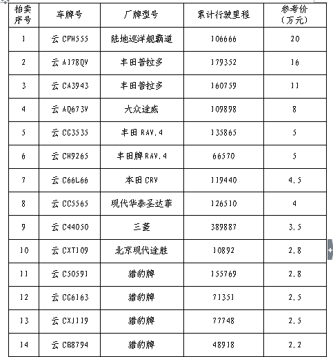 經(jīng)鎮(zhèn)雄縣人民政府批準(zhǔn),受鎮(zhèn)雄縣國(guó)有資產(chǎn)管理局委托,公開拍賣鎮(zhèn)雄縣公車20輛。以輛為單位拍賣。相關(guān)事項(xiàng)如下: