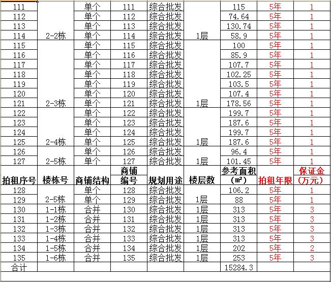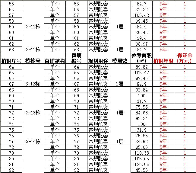 (一)拍租單個(gè)商鋪129間,使用期5年,每間商鋪預(yù)交競租保證金1萬元, 詳見商鋪簡介(欲競租多間商鋪,保證金類推);