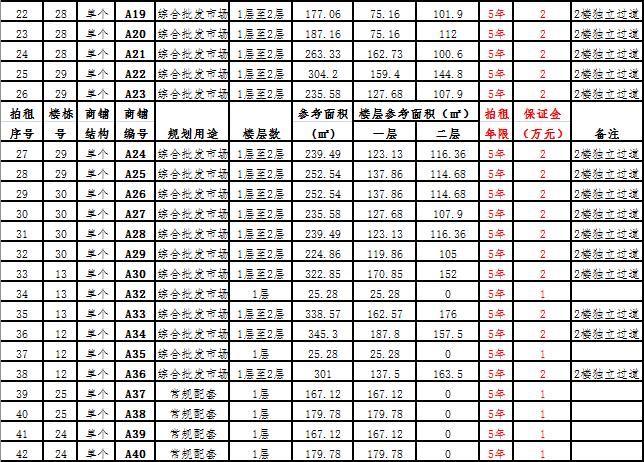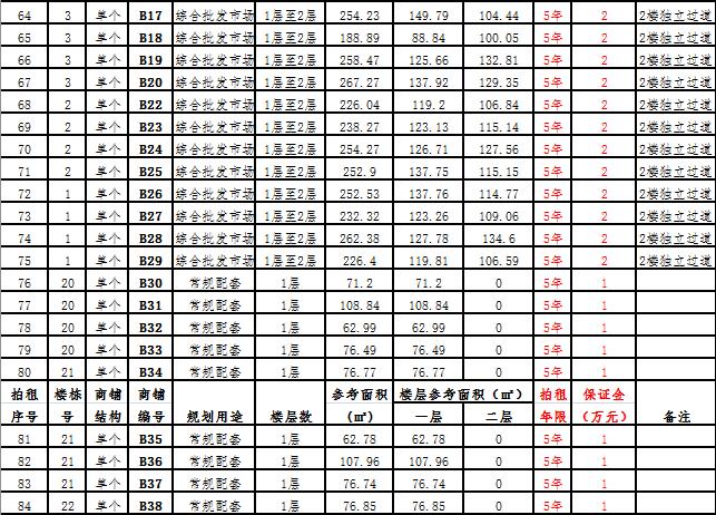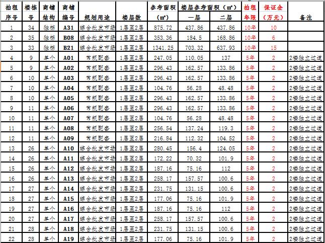 (一)拍租一層至二層獨(dú)棟商鋪3棟,使用期10年,每棟商鋪預(yù)交競(jìng)租保證金6萬(wàn)元至15萬(wàn)元不等, 詳見(jiàn)商鋪簡(jiǎn)介(欲競(jìng)租多棟商鋪,保證金類(lèi)推);