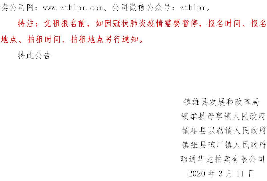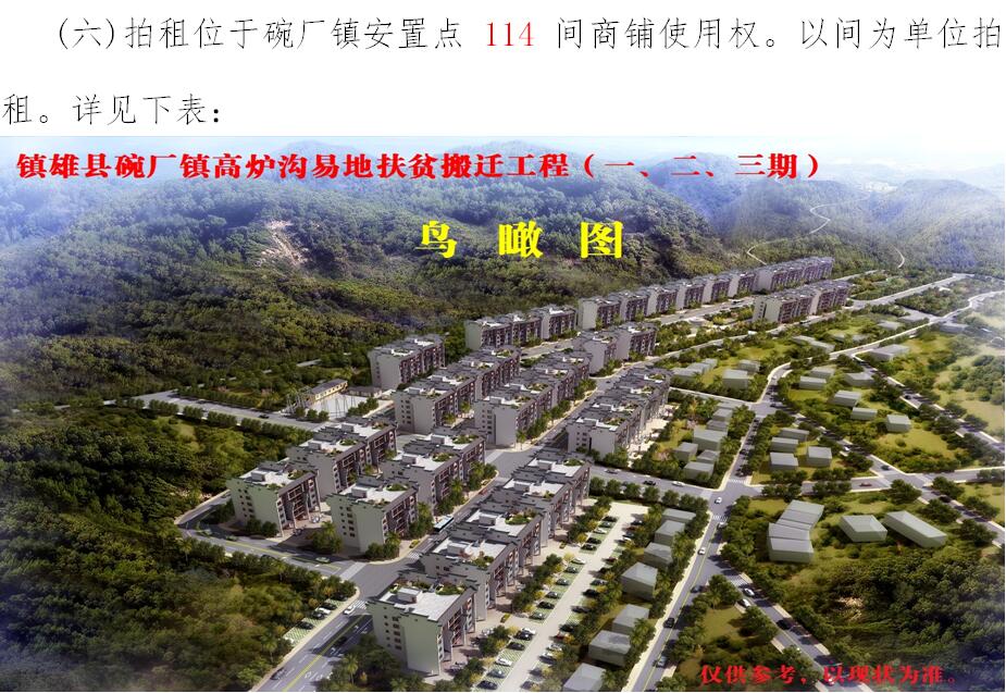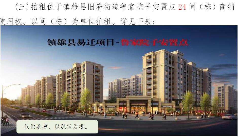 經(jīng)鎮(zhèn)雄縣人民政府批準(zhǔn),受相關(guān)部門(政府)委托,公開拍租位于鎮(zhèn)雄縣易地扶貧搬遷工程呢嚕坪安置點7棟獨立商鋪使用權(quán)、高山大地安置點27間(棟)商鋪使用權(quán)、魯家院子安置點24間(棟)商鋪使用權(quán)、母享安置點146間商鋪使用權(quán)、以勒物流城安置點67間(棟)商鋪使用權(quán)、碗廠安置點114間商鋪使用權(quán)。相關(guān)事項如下: