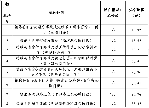 受鎮(zhèn)雄縣物業(yè)管理中心委托:公開(kāi)拍租鎮(zhèn)雄縣主城區(qū)內(nèi)8個(gè)公廁門面3年期經(jīng)營(yíng)權(quán)。相關(guān)事項(xiàng)如下: